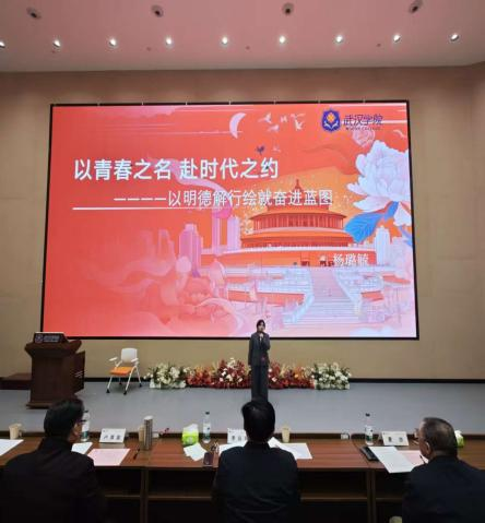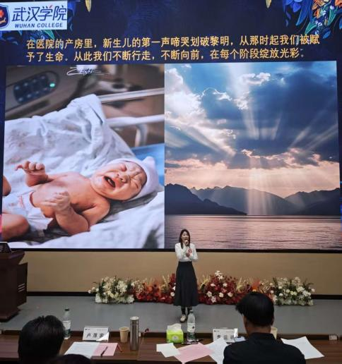决赛正式开始前,武汉学院马克思主义学院德法教研室罗玮主任上台致辞。她深刻解读了“明德、解行、立志” 的核心内涵。“明德是立身之本,解行是成事之基,立志是前行之灯”,并寄语选手们以真诚的情感、鲜活的事例诠释校训精神,分享青春感悟。同时,罗主任希望在场同学以品德为根、实践为翼、理想为帆,在奋斗中书写精彩篇章。